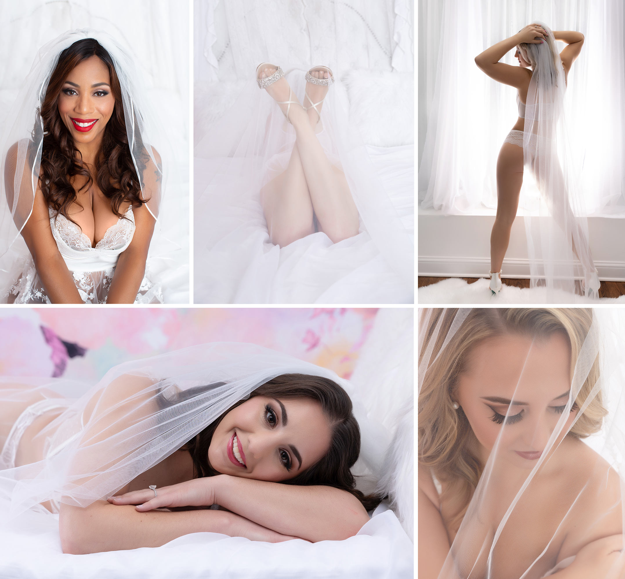 If you are getting married, consider bringing your bridal accessories to your boudoir shoot, including your wedding garter, veil, shoes and engagement ring. We have garters, wedding veils and pearls at the studio that you can borrow for your shoot.